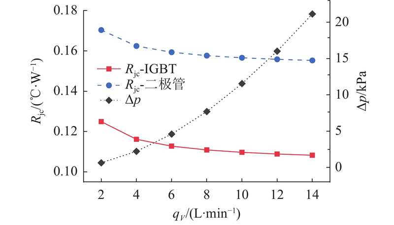 Abstract To improve the cooling performance of power modules in new energy vehicles, a fluid–thermal–solid coupling numerical method was used to analyze the thermal management of an insulated gate bipolar transistor (IGBT) power module. A three-stage design optimization method, including contribution quantification, surrogate modeling, and overall optimization, was proposed. A numerical model of the IGBT power module was established in ANSYS Fluent, and the resulting relative error between the simulation and the experimental data was 3.7%. The effects of substrate ceramic material, coolant flow rate, and Pin-Fin geometry on thermal performance were analyzed, showing that convective thermal resistance and ceramic layer resistance are the main factors affecting chip thermal resistance. Based on surrogate modeling and multi-objective optimization, the design of a 750 V/820 A H-Boost IGBT power module was optimized. The optimized design reduced chip thermal resistance by 21.1%, pressure drop by 39.3%, and module mass by 6.1%.