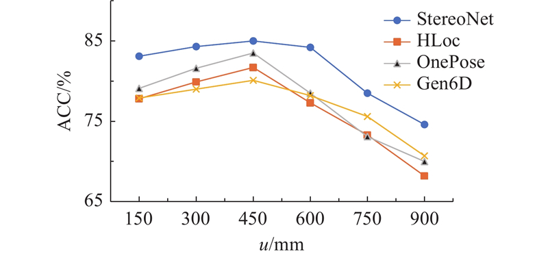 针对传统位姿估计方法中依赖CAD模型的问题,提出基于多视图几何的双目数据集制作方法及基于3D关键点的物体6D位姿估计网络StereoNet. 通过3D关键点估计网络获取物体的3D关键点,在网络中引入视差注意模块,提高关键点预测的精度. 采用运动恢复结构(SfM)方法重建物体的稀疏点云模型,将查询图像的3D点与SfM模型中的3D点输入图注意力网络(GATs)中进行匹配,通过RANSAC和PnP算法计算得到物体的6D位姿. 实验结果表明,当对3D关键点估计时,StereoNet的MAE评价指标较KeypointNet、KeyPose高1.2~1.6倍. 在6D位姿估计方面,StereoNet的5 cm 5°和3 cm 3°评价指标均优于HLoc、OnePose、Gen6D,平均精确度达到82.1%,证明该网络具有良好的泛化性和准确性.