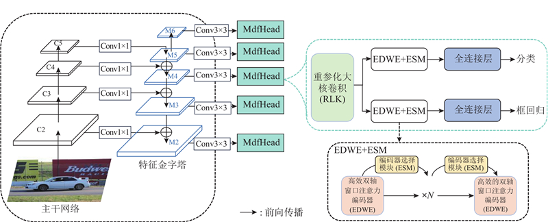 Abstract An object detection algorithm based on multi-azimuth perception deep fusion detection head was proposed to address the challenge that traditional object detection heads struggled to effectively capture global information. An efficient dual-axial-window attention encoder (EDWE) module was designed to enable the network to deeply fuse the captured global information and local information. A reparameterized large kernel convolution (RLK) module was employed after the feature pyramid structure to alleviate feature space discrepancies from the backbone network and enhance the network’s adaptability to small and medium-sized datasets. An encoder selective-save module (ESM) was introduced to selectively accumulate the outputs from the EDWE module and optimize the backpropagation process. Experimental results demonstrated that on the larger-scale MS-COCO2017 dataset, the AP values were improved by 2.9, 2.6, and 3.4 percentage points when the proposed algorithm was applied to the common models RetinaNet, FCOS, and ATSS, respectively. On the smaller-scale PASCAL VOC2007 dataset, the proposed algorithm achieved improvements of 1.3, 1.0, and 1.1 percentage points in the AP values of the three models respectively. Through the synergistic integration of the EDWE, RLK, and ESM modules, the proposed algorithm effectively enhances the object detection accuracy and has significant performance advantages across datasets of varying scales.