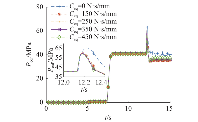 Fig.17 Comparison of maximum pressures in lower chamber of column after impact under different equivalent damping coefficients