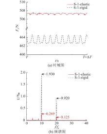 为了探究弹性螺旋桨在航行体复杂伴流场中的结构变形规律及其对激励力的影响机理,采用计算流体力学/有限元流固耦合方法开展航行体-螺旋桨组合模型的数值模拟. 根据由谐调分析得到的均匀与非均匀水下伴流场特性,分析不同伴流场中弹性螺旋桨的稳态变形与动态变形规律. 对比刚性与弹性螺旋桨的激励力时均值与脉动幅值的差异,分析结构变形对激励力产生影响的内在机理. 研究结果表明,弹性螺旋桨的稳态变形主要由伴流场中的时均载荷驱动,螺距角增大导致轴向力时均值提升了9.5%;动态变形主要由非均匀伴流场中的脉动载荷驱动,能够缓冲来流激励并自适应调节,从而显著抑制螺旋桨轴向激励力叶频处的脉动幅值,降幅达到86.1%. 研究揭示了弹性螺旋桨结构变形对激励力的调控机制,为船舶推进系统的应用和激励力控制提供了理论依据.
