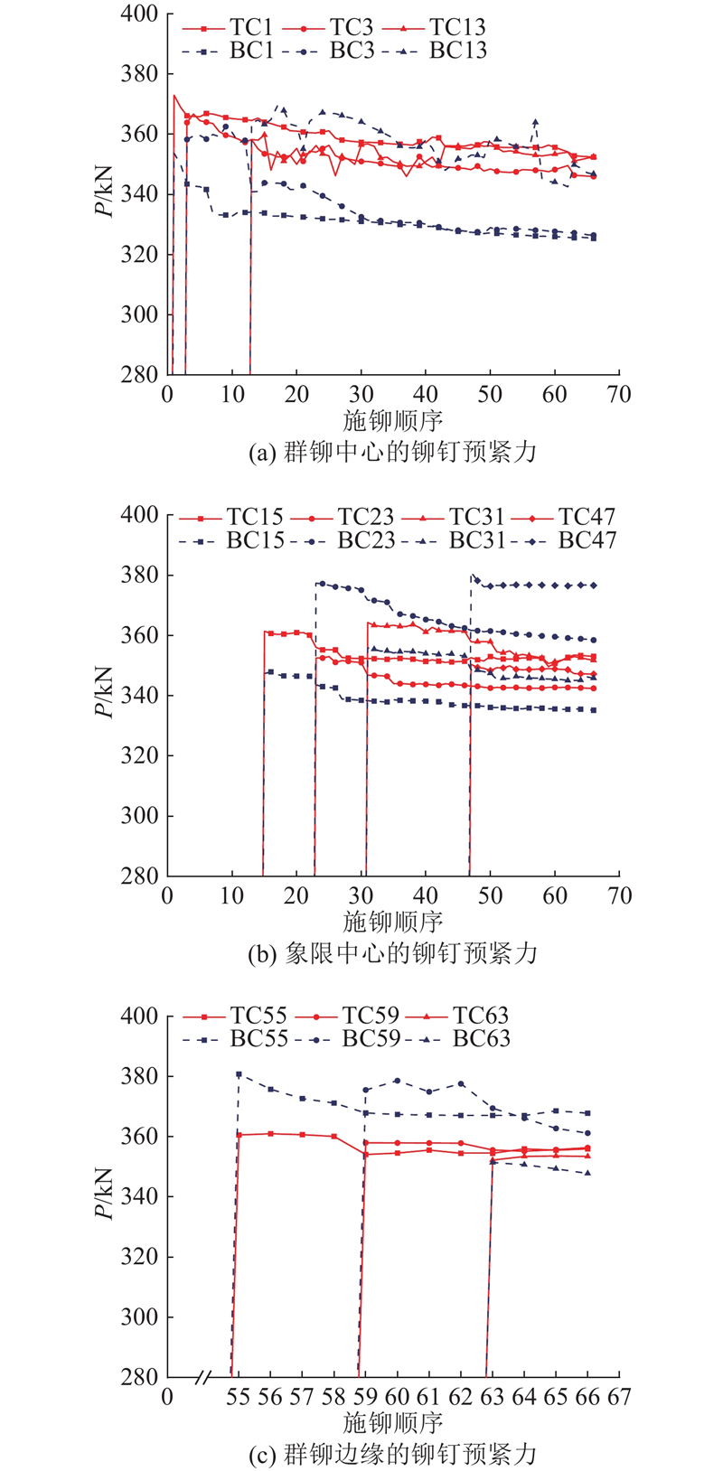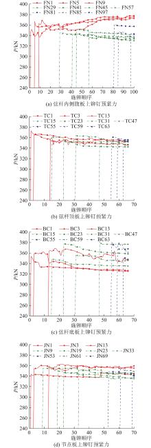 Fig.10 Comparison of rivets’ pre-tightening force in different areas of chord top and bottom plates