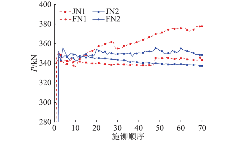 为了研究施铆过程中环槽铆钉预紧力的影响因素,评估钢桁梁拼接节点中环槽铆钉预紧力的稳定性,以钢桁梁悬索桥为依托工程,开展足尺节点施铆过程的铆钉预紧力监测试验. 结果表明,环槽铆钉在从刚度大的接头区域向刚度小的接头区域铆接时,适用性较好;测试的10.9级T27铆钉的铆后预紧力满足环槽铆钉预紧力要求,且优于同规格高强度螺栓;铆接过程中厚度更大的底板上的铆钉预紧力变化量比顶板有所增加,且预紧力松弛程度稍大;约束程度更高的腹板上的铆钉预紧力变化量比节点板更大. 对弦杆腹板进行铆接后48 h监测试验,结果显示铆接完成后30 h内铆钉预紧力衰减量占总衰减量的89.6%,此后预紧力的波动小于1.3%的初始值,表明环槽铆钉铆后预紧力损失较小,且逐渐趋于稳定、统一.
