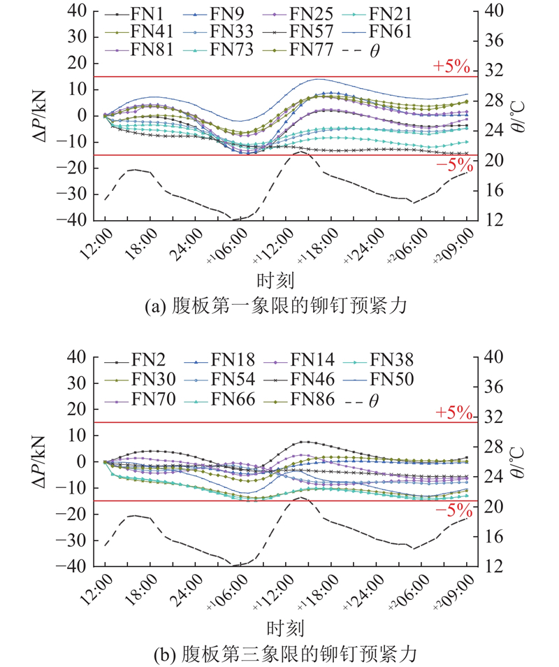 Fig.12 Variation curve of rivets’ pre-tightening force on web plate in natural environment