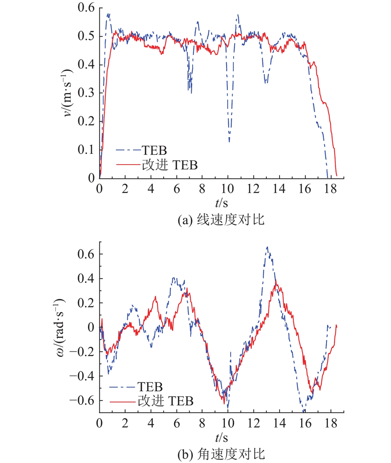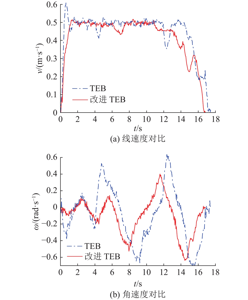 针对时间弹性带(TEB)算法在复杂环境下出现加速度变化率突变、控制指令不平滑的问题,提出改进的TEB算法. 在原始TEB算法基础上引入加加速度(jerk)约束来平滑速度和加速度曲线,避免机器人在运动过程中发生震荡、抖动现象. 采用自适应调整弹性带节点数量的方法来自适应调整插值点,提高机器人移动过程中的安全稳定性. 为了验证改进TEB算法的有效性,选取远距离长狭窄走廊环境和多转弯包含反向停车环境对APF算法、DWA算法、传统TEB算法和改进TEB算法进行仿真对比实验. 结果表明,改进TEB算法能生成更平滑路径. 在走廊环境中,其线速度方差、平均角速度、角速度方差分别较传统TEB降低了16.67%、7.38%、12.84%;在多转弯环境中,则分别降低了8.61%、4.34%、8.58%,速度与角速度更加平滑. 另外,在真实实验环境下验证了算法的有效性.