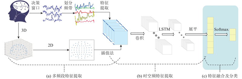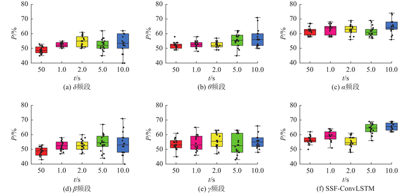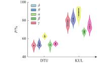 针对听觉注意力检测方法忽视脑电信号频段特异性贡献的问题,提出时空频特征融合框架(SSF-ConvLSTM). 该框架系统评估$\delta $(1~4 Hz)、$\theta $(4~8 Hz)、$\alpha $(8~13 Hz)、$\beta $(13~30 Hz)和$\gamma $(30~50 Hz)频段的差异化贡献,从而实现关键频段的定量筛选与动态耦合建模. 通过脑地形图揭示不同频段神经活动的空间权重分布,筛选与目标语音编码密切相关的频段. 构建SSF-ConvLSTM模型,通过卷积层提取频带空间特征,并融合长短时记忆网络(LSTM)对注意力时变动态的建模能力,从而实现跨频段时空动态特征的联合解码. 在公开KUL和DTU数据集上进行算法验证,结果表明:随着频率不断增高,与听觉注意解码相关的额叶和颞叶权重在$ \alpha$频带达到峰值,随后至$\gamma $频带逐渐降低;在KUL数据集上,低频带$\alpha $在5 s决策窗口具有最优解码精确度93.38%,较基线模型提高了9.78个百分点;在DTU数据集上,$\alpha $频带解码精度较基线模型显著提高5.5个百分点. 本研究证实了频段特异性特征对AAD解码的关键作用,为开发基于特征优化的新型频段-时空耦合脑机接口提供了理论依据.