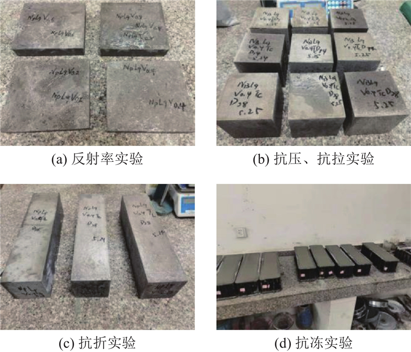 为了提高功能陶粒占比,依据前期试验确定混凝土中各组分体积比为水泥浆体∶粗集料∶细集料=0.3∶0.5∶0.2. 胶凝材料采用水泥和FA(体积比为4∶1),掺入水泥质量为1%的聚羧酸减水剂,水灰质量比为0.4. 纤维体积掺量为0.2%~0.8%,“弓形法”反射率试件尺寸为180 mm×180 mm×40 mm,利用水泥净浆搅拌机拌和,将水泥、砂、FA、吸波陶粒和纤维等原料干拌90 s(纤维须人工处理成松散状),再将水和减水剂按照一定比例配入,搅拌60 s后出料. 将拌合物铲入特制尺寸的钢模具,经振动台振动30 s后,刮平试样表面,静置室内24 h后拆模,置于标准养护箱养护28 d. 力学性能和抗冻性能试件采用单卧轴搅拌机参照反射率测试板制备流程拌和,根据不同的试验检测要求将拌合物铲入对应塑料模具中成型,其中抗压、劈裂抗拉试件尺寸为100 mm×100 mm×100 mm,养护7、14和28 d,抗折、抗冻试件尺寸为100 mm×100 mm×400 mm,养护28 d,各类试件如图2所示.