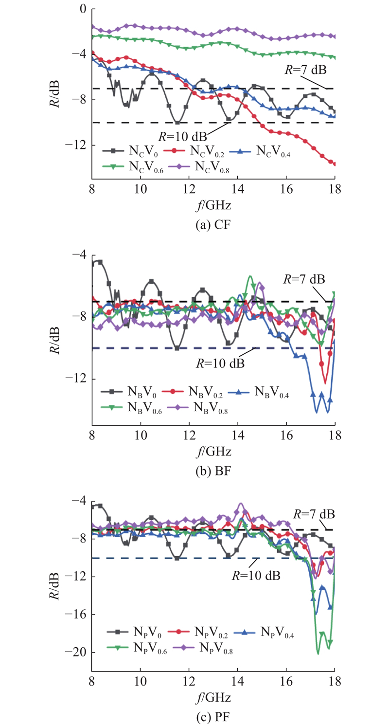 如图3所示为各纤维组分电磁吸波集料混凝土在不同纤维掺量下电磁波反射率与频率的曲线关系. 相比CF组分试验结果,BF和PF掺入后改善了混凝土的电磁吸波性能,且反射率曲线变化规律基本相似:X波段反射率在−8.5~−6 dB波动,在Ku波段出现1~2个吸收峰,大幅降低反射率,如NBV0.4在17.25 GHz处最小反射率为−14.14 dB,NPV0.6反射率峰值为−20.11 dB. 纤维种类和掺量是影响混凝土电磁性能的重要因素. 图3(a)中,受趋肤效应影响,NCV0.2反射率基本随频率增大而减小,相较于无纤维组分在Ku波段反射率有显著降低,整个Ku波段反射率均小于−7 dB,但随着CF掺量的增加,混凝土内部介电常数增大,实验测得,V0.8碳纤维水泥砂浆的相对介电常数实部的最大值为119.97,普通水泥砂浆的最大值为8.45,造成混凝土与自由空间阻抗匹配差,使入射电磁波在混凝土表面发生强反射,增大了反射率. 掺入介电常数较小的纤维后,混凝土反射率曲线受掺量变化波动幅度较小,无强反射现象出现,但仍存在掺量阈值. 当f=8~18 GHz时,BF的介电常数在2.63附近波动,当介电损耗在−0.005~0.01左右[18],相较于CF,透波性能较好. 图3(b)中,BF体积分数较低的NBV0.2、NBV0.4的反射率曲线均有明显吸收峰,特别是NBV0.4吸波效果提升明显,整个测试频段小于−7 dB带宽为9.80 GHz,小于−10 dB带宽为1.70 GHz;当BF掺量较高时反射率曲线无明显吸收峰,反射率小于−7 dB的带宽超过9 GHz,但峰值却高于−10 dB. 图3(c)中,PF体积分数从0.2%到0.6%,反射率峰值逐渐下降,反射率曲线整体下移,NPV0.4小于−7 dB带宽为9.65 GHz,NPV0.6小于−10 dB带宽为1.45 GHz;NPV0.8的反射率峰值能到−12.15 dB,但相较NPV0.6反射率曲线整体上移,小于−7 dB带宽为1.75 GHz,原因可能是PF介电常数相对更低,在混凝土中掺量增加,部分电磁波进入后未经损耗就原路反射回自由空间.