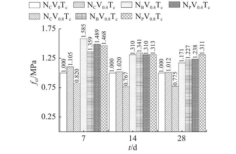 抗压试验结果表明,无纤维组分电磁吸波集料混凝土7、14和28 d的抗压强度分别为31.4、36.9和42.8 MPa,达到一般结构材料的抗压性能要求. 如图4所示,以NCV0Tc各龄期强度指标为基础,换算得到其他各组各龄期的相对抗压强度fcr. 可以看出,纤维的掺入改善了电磁吸波集料混凝土各龄期抗压强度,不同纤维种类和掺量对各龄期抗压强度的影响不同. PF和BF的改善效果好于CF,且CF受掺量影响较大,在低掺量下,CF增强了试件的抗压强度,但当掺量为0.8%时,各龄期试件抗压强度下降明显. PF能够在各龄期提升试件抗压强度,NPV0.4Tc和NPV0.8Tc的抗压强度相近,相较于基础组,早期强度得到大幅提升,增幅为48.94%和46.83%,各龄期增幅均超23%,当PF掺量为0.8%时,混凝土抗压强度为56.0 MPa. BF对早期抗压强度增强明显,相较于基础组,NBV0.4Tc和NBV0.8Tc早期抗压强度提高了58.45%和35.92%,但随着养护时间的增加,各龄期相对抗压强度的增幅平缓.