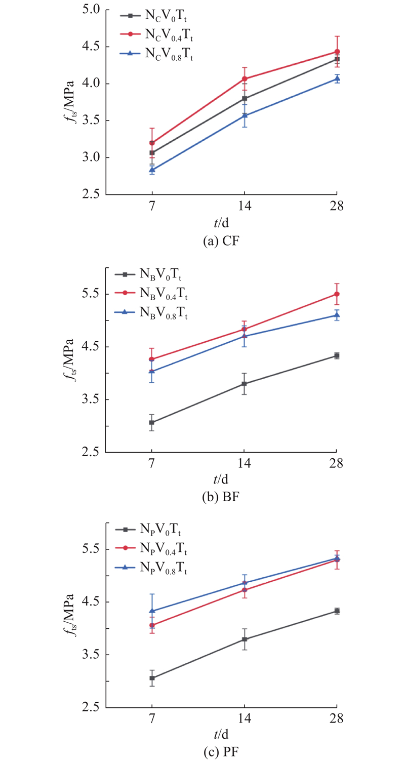 如图5所示为各类纤维组分电磁吸波集料混凝土在不同纤维掺量下各龄期的劈裂抗拉强度fts. 无纤维组分试件7、14和28 d的劈裂抗拉强度分别为3.1、3.8和4.3 MPa,高于普通混凝土规范要求. 纤维组分对电磁吸波集料混凝土劈裂抗拉强度的影响同抗压强度结果相似. CF组分在低掺量下可提高劈裂抗拉强度,但在高掺量下,NCV0.8Tt较基础组各龄期劈裂抗拉强度分别降低了9.68%、5.26%和4.65%. BF和PF掺入后对电磁吸波集料混凝土劈裂抗拉强度增强效果较好,特别是早期各掺量下强度增幅均在30%左右,养护28 d后,试件劈裂抗拉强度超过5.2 MPa. BF组分中,NBV0.4Tt各龄期的劈裂抗拉强度均高于NBV0.8Tt,前者28 d强度为5.5 MPa;PF组分中,NPV0.8Tt各龄期劈裂抗拉强度略高于NPV0.4Tt,2组试件28 d的劈裂抗拉强度能为5.3 MPa.