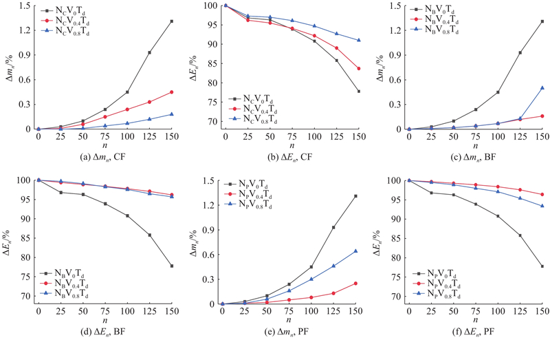为了得到特殊环境下电磁吸波集料混凝土的抗冻性能,拓宽电磁吸波集料混凝土的应用背景,使用TDR-1全自动混凝土快速冻融试验机、DT-W18动弹性模量测定仪和天平等开展纤维组分电磁吸波集料混凝土抗冻性能测试. 共测试7组21个试件,基本方法如下:将各组试件放入快速冻融箱,试件中心的最低温度为(−18±2)℃,最高温度为(5±2)℃,冻融循环周期为2.7 h,融化时间为1.15 h. 共进行150次冻融循环,从未放入快速冻融箱(0次)起,每隔25个冻融循环将试件取出,测试横向基频与质量. 根据《普通混凝土长期性能和耐久性能试验方法标准 GB/T 50082—2019》,每组取3个试件平均值为指标参数,换算得到表征混凝土抗冻性能的重要指标:相对动弹性模量ΔEn和相对质量损失Δmn. 当Δmn>5%或ΔEn<60%时,停止试验,此时混凝土冻融循环次数n即抗冻等级Fn.