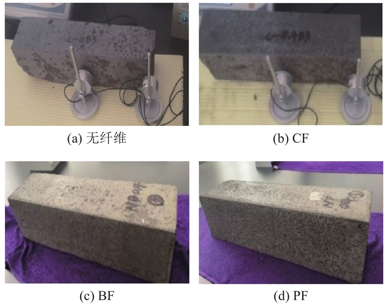 如图9为无纤维和纤维组分试件经历150次冻融循环后的外观形态. 可以看出,无纤维组分试件无大块脱落或整体断裂,但仍出现少量缺角破损或陶粒裸露;纤维掺入可有效延缓内部微裂缝的扩展,阻断部分水渗透入混凝土内部的通道,使混凝土内部趋向于整体,冻融后纤维组分试件因混凝土表面脱落使外观出现麻面,保持一定整体性.