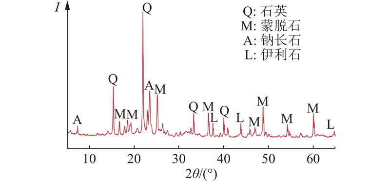 试验用土为南宁市某道路工程弃方,土料基本物性指标如下:相对密度为2.72,最大干密度为1.61 g/cm3,水的质量分数(最优)为22.28%,液限为74.9%,塑性指数为46.90,自由膨胀率为78%,标准吸湿含水率为5.2%,其中最大干密度及水的质量分数(最优)通过Ⅱ1重型击实试验获得;土料粒径为 (0, 2)、[2, 5)、[5, 75)、[75, 100] μm的质量分数分别为41.6%、27.0%、30.0%和1.4%. 如图1所示为膨胀土样品的X射线衍射(X-ray diffraction,XRD)图谱. 由图可知,土料矿物成分主要为石英(30.20%)、蒙脱石(44.70%)、钠长石(7.20%)及伊利石(6.10%),自由膨胀率为78%,标准吸湿含水率为5.20%,参照《公路工程地质勘察规范(JTG C20—2011)》判定为中等膨胀土.