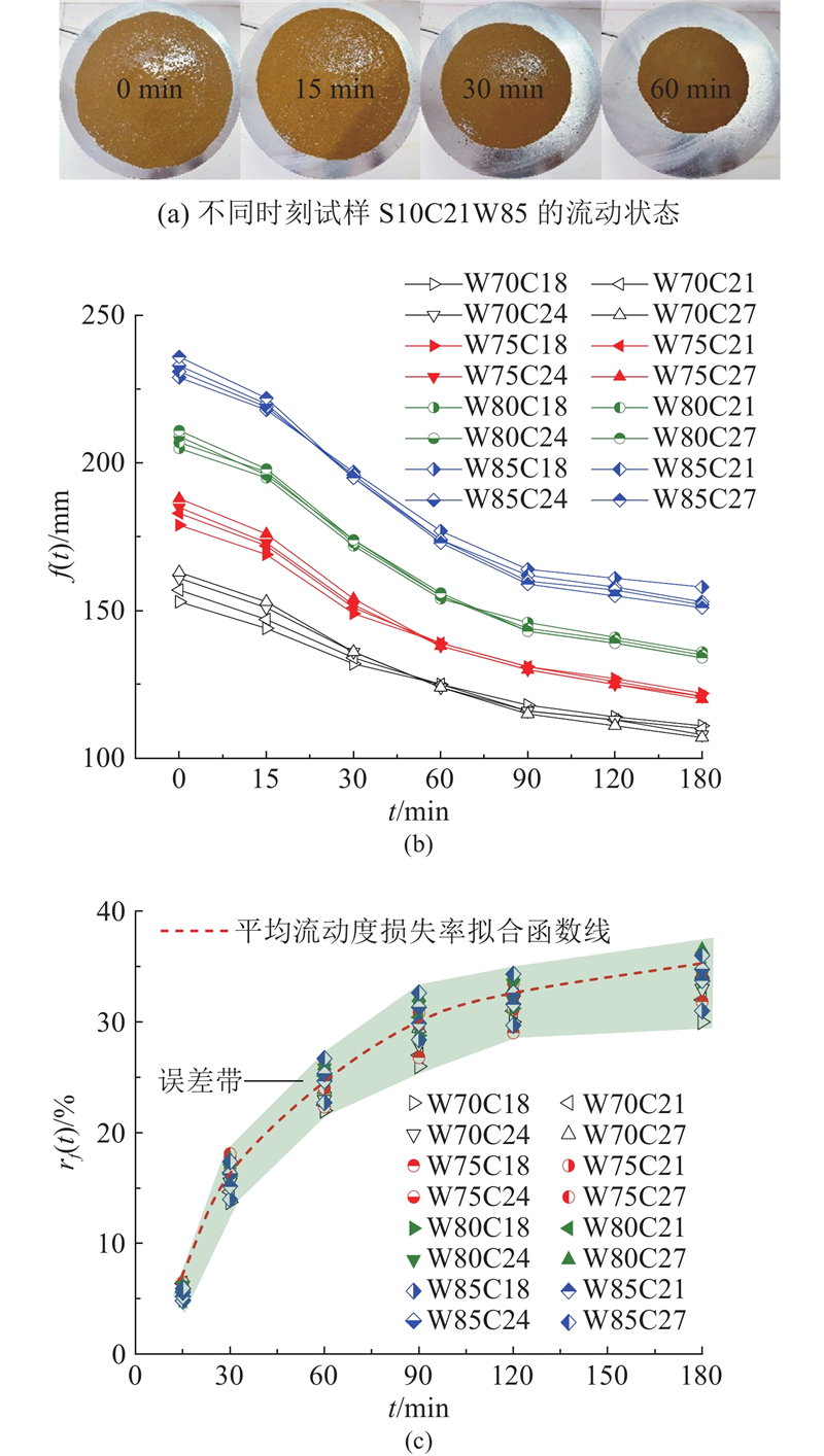 (3) 试样初始流动度与掺砂比、掺灰比和水固比呈正相关,受水固比影响最显著,掺砂比次之. 试样初始流动度损失的主要时间段在拌合完成后的0~90 min,损失率为23%~32%,3 h损失率为28%~36%.