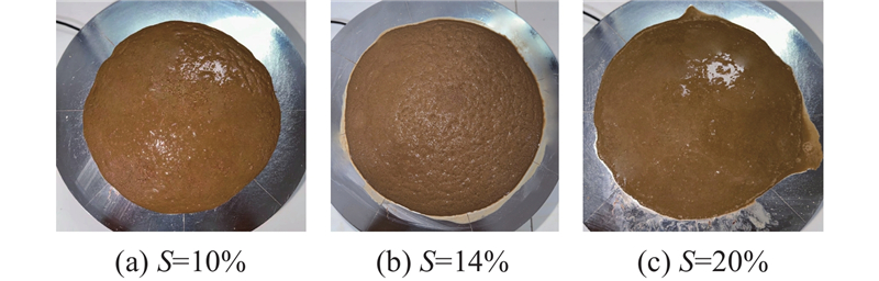 参照《公路工程水泥及水泥混凝土试验规程(JTG3420—2020)》,采用NLD−3型水泥胶砂流动度测试仪开展试验. 混合料装入截锥圆模直至填满,随后脱模、启动电动机,在跳桌台面上下振动25次,测取混合料最大摊开方向及与之垂直方向的平均值,得到流动度.