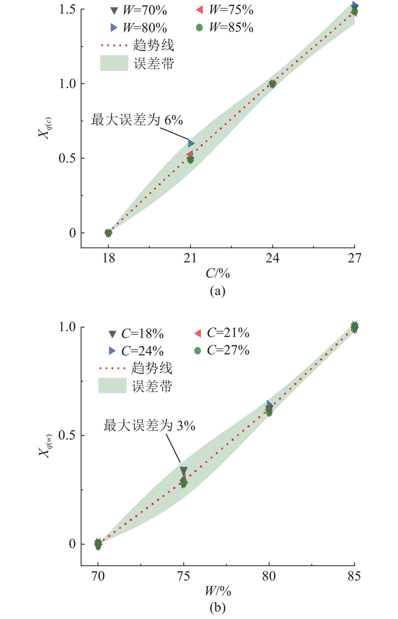 式中:qu(C,70)、qu(C,85)为W=70%及85%时Xq(w)的归一化特征点强度. 由式(6)可知,当C一定时,不同W下的Xq(c)近似相等,如图14(a);即Xq(c)与C的归一化效果较好,可以得到Xq(c)与C的拟合函数关系为