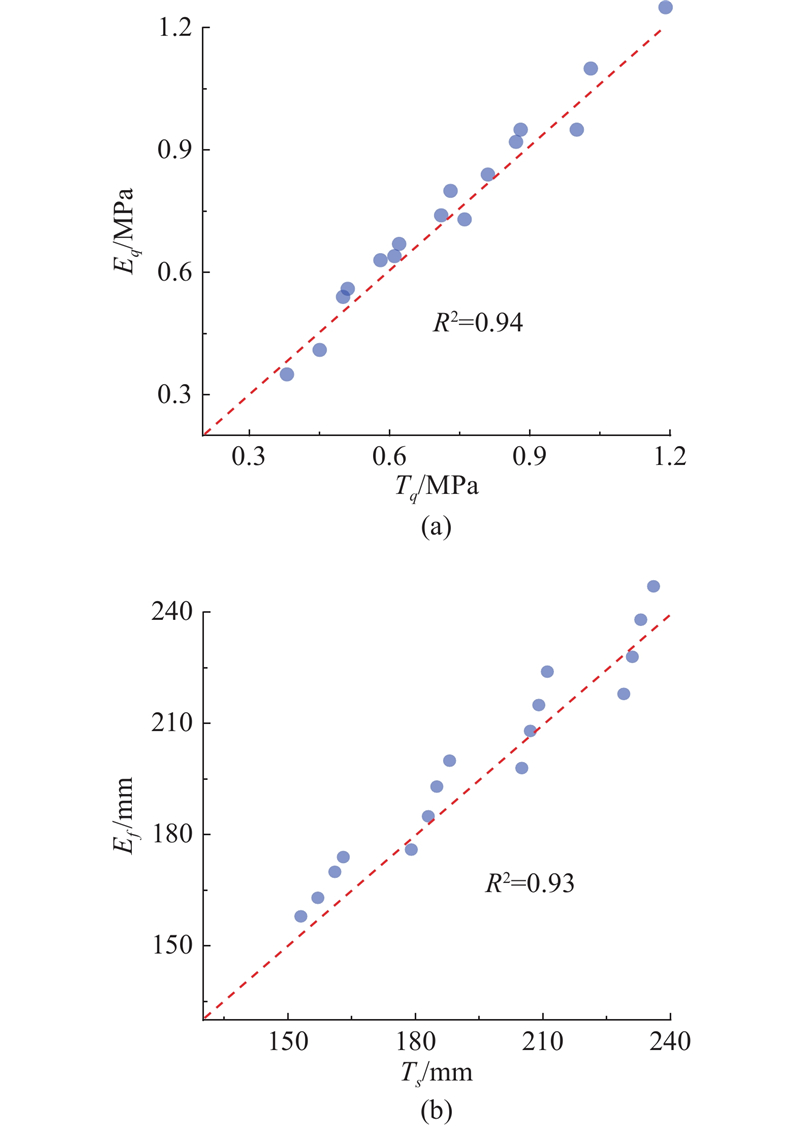 为了验证配合比设计流程,针对一般道路路基与三背回填,考虑2种耐久性水平,进行配合比设计. 在不考虑干湿循环的情况下,S10C19W70试样14 d强度和初始流动度估算值为0.83 MPa、153 mm,满足一般道路路基填筑所需的0.80 MPa和140 mm[7,11,23]; S10C20W76试样14 d估算强度为0.69 MPa、流动度为188 mm,满足三背回填所需的0.65 MPa和185 mm[7,11,25]. 在考虑干湿循环的情况下,参照图9(a)可知S10C19W70和S10C20W76试样干湿循环下达到稳定时的强度残余率分别约为79%和77%,因此试样设计强度建议分别提高为未考虑耐久性的1.25及1.30倍,配合比宜分别调整为S10C23W70及S10C25W75. 对设计的4类配合比进行实测检验,与估算值比较的结果如表5所示. 表中,δ为相对误差. 由表可知,设计试样的抗压强度及流动度满足工程要求;比较实测值与估算值,最大相对误差分别低于7%、6%,表明式(11)、式(12)有较好估算精度[27-28].