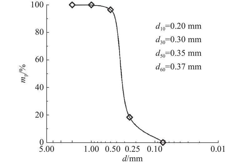 标准砂具备较精确级配和物理性质,可降低砂物理特性指标差异对试验规律产生的影响. 为此采用福建标准砂为试验用砂,级配曲线如图2所示,其中mp为小于某粒径d的颗粒质量百分数. 粒径为0.25~0.50 mm的颗粒质量超过用砂总质量的50%,参考《公路土工试验规程(JTGD3430—2020)》,用砂属于中砂.
