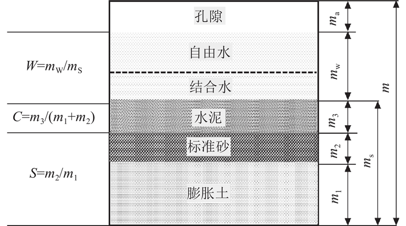 混合料性能取决于配合比,多相示意如图3所示. 以干燥膨胀土为基料,按质量掺配比添加各类材料配置流态固化土. 定义砂与干土质量比为掺砂比S,水泥与干土、砂两者质量和之比为掺灰比C,水与固体干质量比为水固比W;采用如“S10C21W70”的编号表示掺砂比为10%、掺灰比为21%和水固比为70%的配合比. 根据试测试验及砂改良膨胀土的相关研究[18],选取掺砂比为6%~14%,以2%为步长开展5种试验. 基于土料液限及流动度指标,选取水固比为70%、75%、80%及85%. 水泥质量一般占干土的7%~25%[12],选定水固比试测后选取掺灰比为18%,21%、24%和27%. 取较优掺砂比为10%,探究龄期与干湿循环对试样无侧限抗压强度的影响. 试验方案如表1所示.