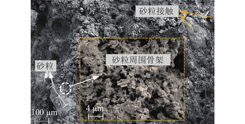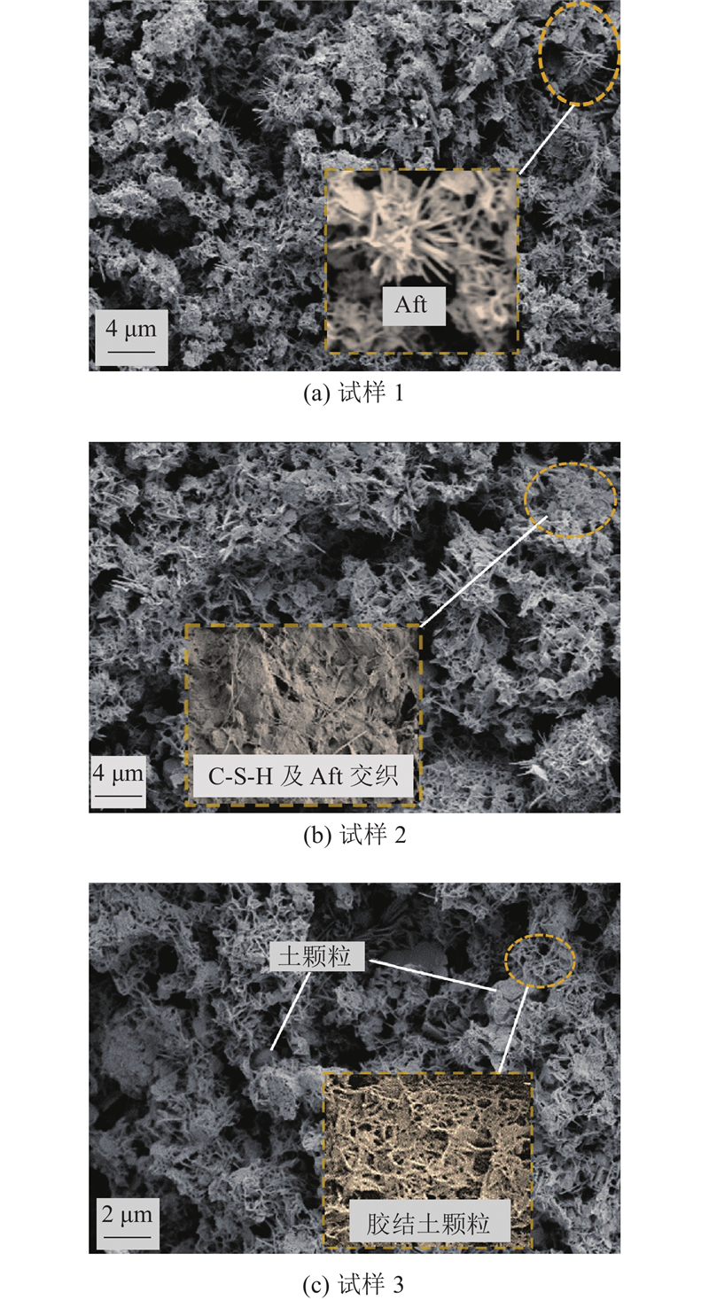 膨胀土中水泥水化生成Ca(OH)2、水化硅酸钙凝胶(C-S-H)与水化铝酸钙(C3AH6)等产物. 随着水化反应的进行,C3AH6与石膏生成针状钙矾石(Aft);且Ca(OH)2达到饱和后会与如土颗粒表面SiO2的活性物质发生火山灰反应,再生成C-S-H(硬凝). C-S-H与Aft交织成网状,填充土颗粒间孔隙,胶结、包裹土颗粒形成胶凝骨架,是土体抗压强度的主要来源[20-21]. 同一配合比(S10C21W70)的3个试样养护14 d的扫描电镜(scanning electron microscope,SEM)影像如图6所示. 图6(a)中有针状物生成,表明水泥水化生成了Aft;图6(b)和图6(c)中有大量网状物生成,表明Aft及C-S-H相互交织,填充了颗粒间孔隙,并与土颗粒形成胶凝骨架,土体强度得以增强.