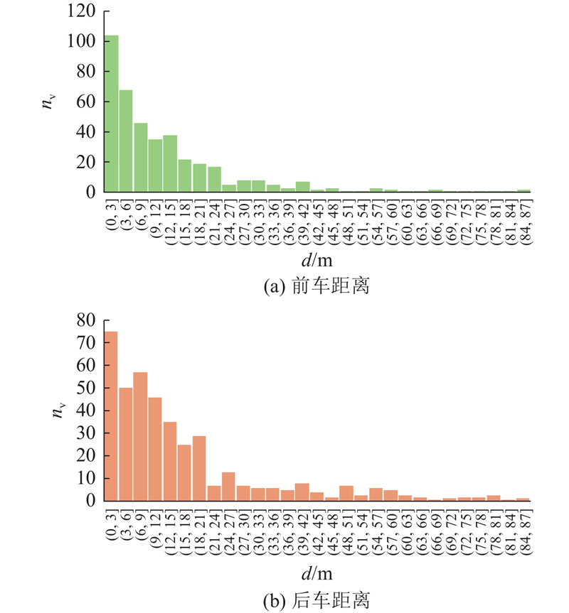 数据采集点为南京市城东快速路互通交织区段,该交织区既有入口匝道,又有出口匝道,且交织车辆在换道时必须实现1个车道的转换. 如图1所示,城市快速路为单向三车道,辅路为单向两车道,研究区域长120 m. 使用无人机拍摄获取交织区连续7 d早高峰(7:30—8:30)的交通流视频,视频拍摄时天气晴朗. 拍摄视频的分辨率为1 920×1 080,帧率为30 帧/s. 视频中每帧的车辆轨迹数据由中佛罗里达大学SST实验室开发的自动道路冲突识别系统提取[17]. 经视频采集获取初始数据信息,包括帧数(以帧为步长)、车辆ID以及车辆前部、中心和后部的像素坐标. 航拍视频内共有2 241辆车,每辆车包含的车辆轨迹数据为200~300 条,共计获取车辆轨迹数据50 多万条,每条数据包含1辆车在当前时刻的全部信息. 采用仿射变换方法将像素坐标转换为笛卡尔坐标,以平行于车道线的方向为X轴,垂直车道线的方向为Y轴,具体过程可参考Zhao等[6]的研究成果.对获取的数据进行过滤,得到nv=478 辆车的完整变道行为数据,收集当前车道和目标车道上前后车辆的交通行为数据. 选择包括目标车道中没有车辆或者目标车道中前后车辆远离目标车辆100 m的情况,设置目标车道中的前后车辆与目标车辆的距离为零,即认为目标车辆前后无车. 目标车道上前后车辆距离的统计分布如图2所示,其中d为车辆间距,不包括零距离. 在换道过程中,共有56 辆车的目标车道上没有车辆在前,89 辆车的目标车道上没有车辆在后.