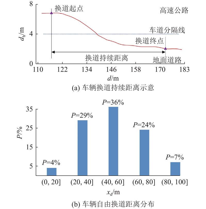考虑到车辆轨迹的不稳定性,结合目标车辆的横向运动和在车道内的位置确定每种换道行为的起始点和完成点. 起始点定义为横向运动开始且车辆中心距离目标车道中心线三分之一车道宽度时的空间位置,完成点定义为横向运动尚未结束且车辆中心距离原始车道中心线三分之一车道宽度时的空间位置. 定义中选择车道宽度的三分之一的原因:确保目标车辆在当前车道内且不会影响相邻车道的交通. 如图3(a)所示为某换道车辆换道的完整轨迹,其中dh为横向位置. 可见,换道持续距离即为换道起点到换道终点沿车道方向上移动的距离. 如图3(b)所示为调查所得车辆的换道持续距离分布,其中xd为车辆的换道持续距离,最大值为97.4 m,最小值为10.7 m,平均换道持续距离为50.4 m,约90%换道车辆的换道持续距离在20~80 m.