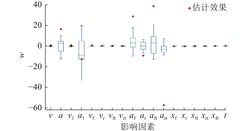 因果效应的反驳结果如图5所示. 图中,w为影响因素在反驳测试后的因果估计效应. 根据因果推断中的安慰剂反驳检验规则,可以估计每个影响因素与结果影响因素之间的因果效应[20],即除了因素a1外,其余因素的估计效果与使用安慰剂治疗的效果有显著差异. 使用安慰剂治疗时的效果往往为0,因此,这些因素对结果影响因素(换道持续距离)有因果影响. 根据不同水平对变量进行分类,利用正负因果效应进行识别,可以得到a、af、aft对结果影响因素具有正因果效应,ar、art对结果变量具有负因果效应. 由此得出:1)目标车辆换道前后的速度和换道持续时间对换道持续距离有显著影响,这符合交通流中的速度-距离-时间三参数关系;2)当前车道和目标车道的前后车速度对换道持续距离有显著影响,这可能是由于前后车和目标车之间相对速度的大小会给目标车或宽松或压抑的换道环境,影响了换道持续距离;3)当前车道和目标车道的前后车间距对换道持续距离有显著影响,这可能是由于前后车和目标车的间距决定了目标车换道时的自由度,影响了换道持续距离. 综合斯皮尔曼(Spearman)相关系数和因果推断分析结果,排除具有相互影响关系的因素,如vf和vr、vft和vrt的重复性,确定影响换道持续距离的因素为v、v1、vf、vft、xf、xr、xft、t.