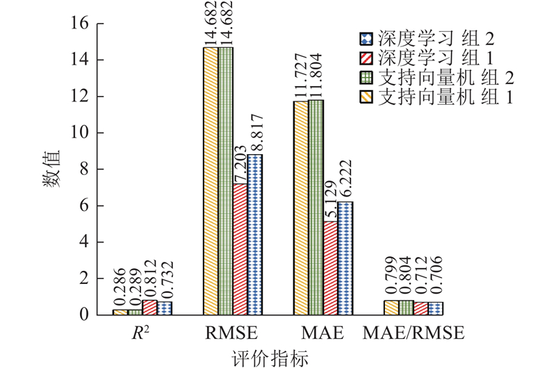 2个实验组数据对支持向量机预测模型和深度学习预测模型的预测结果影响如图7所示. 在不同组数据情况下,支持向量机模型的运行时间分别为1.2、1.4 s,深度学习模型的运行时间分别为204.8、262.9 s,经筛选后的第1组数据集将支持向量机模型的运行效率提高了14%,将深度学习模型的运行效率提高了22%. 不同组数据支持向量机模型的R2、MAE、RMSE以及MAE/RMSE基本一致,可以认为预测结果没有显著性差异,深度学习模型的R2、MAE、RMSE存在显著差异,第1组数据集相较于第2组数据集,R2提升了10%,将MAE提升了18%,将RMSE提升了17%. 可以看出,经筛选后的影响因素能够提升模型的预测效率,也能够提升深度学习模型的预测精度,提升幅度为10%~20%,支持向量机模型的预测精度基本不受影响.