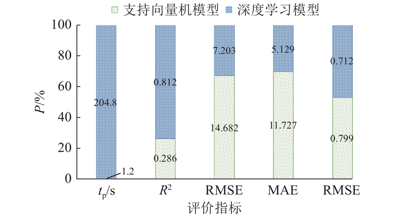 2种预测模型均在第1组数据集下的预测精度更好,因此选用预测时间、R2、MAE、RMSE以及MAE/RMSE对比第1组下2种预测模型的预测结果,指标对比如图8所示. 从预测时间来看,支持向量机模型的训练速度很快,运行时间可以忽略不计,深度学习模型的训练时间为204.8 s;从R2、MAE、RMSE来看,深度学习模型预测精度比支持向量机模型预测精度高;从MAE/RMSE来看,2种模型的值相近,可认为2种模型的预测稳定性相似.