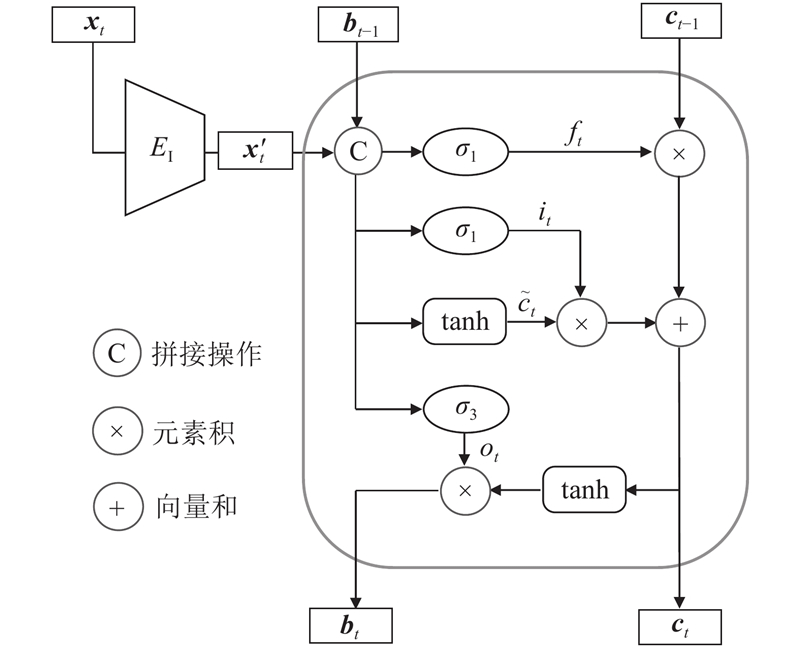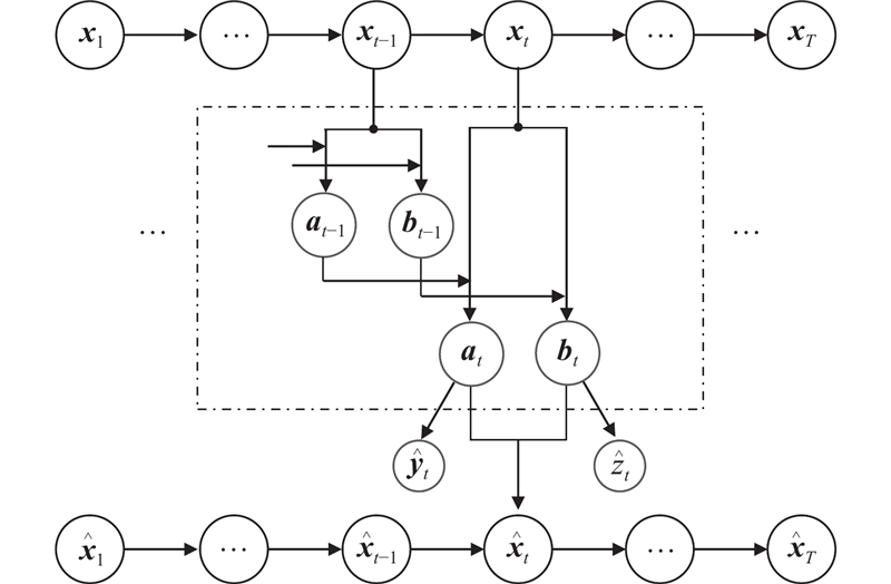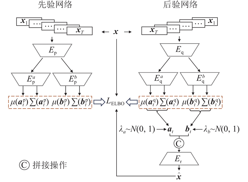 ... 后验网络的编码器$ {E_{\text{q}}} $  和解码器$ {E_{\text{r}}} $  均由3层全连接层构成,隐变量分布$ p\left( {{{\boldsymbol{d}}_t}\mid {{\boldsymbol{d}}_{t - 1}},{{\boldsymbol{x}}_t}} \right) $  通过重参数技巧[19 ] 从正态分布$ N\left( {{\mu _\theta }\left( {{{\boldsymbol{d}}_{t - 1}},{{\boldsymbol{x}}_t}} \right),{\Sigma _\theta }\left( {{{\boldsymbol{d}}_{t - 1}},{{\boldsymbol{x}}_t}} \right)} \right) $  中采样,正态分布的均值和方差向量通过$ E_q^{{a}} $  和$ E_q^{{{{b}}}} $  得到. ${p_\theta }\left( {{{\boldsymbol{o}}_T}\mid {{\boldsymbol{d}}_{T - 1}}} \right)$  表示对解耦后的特征进行故障分类和域分类的过程. 故障相关因素${{\boldsymbol{a}}_T}$  用于故障的识别和诊断,故障无关因素${{\boldsymbol{b}}_T}$  用于数据域的判断. 在重建任务中,解耦后的特征通过1个全连接层后,生成后验分布的均值和对数方差向量,每个时间步的${q_\phi }\left( {{{\boldsymbol{d}}_t}\mid {{\boldsymbol{d}}_{t - 1}},\;{{\boldsymbol{x}}_t}} \right)$  均服从高斯分布$ N(\mu_{\phi}(\boldsymbol{d}_{t-1},\boldsymbol{x}_t),\; \mathit{\Sigma}_{\phi} (\boldsymbol{d}_{t-1}, \boldsymbol{x}_t)) $ .  在高斯分布中采样后, VAE的解码器$ {E_{\text{r}}} $  进行原始序列重建. ...
