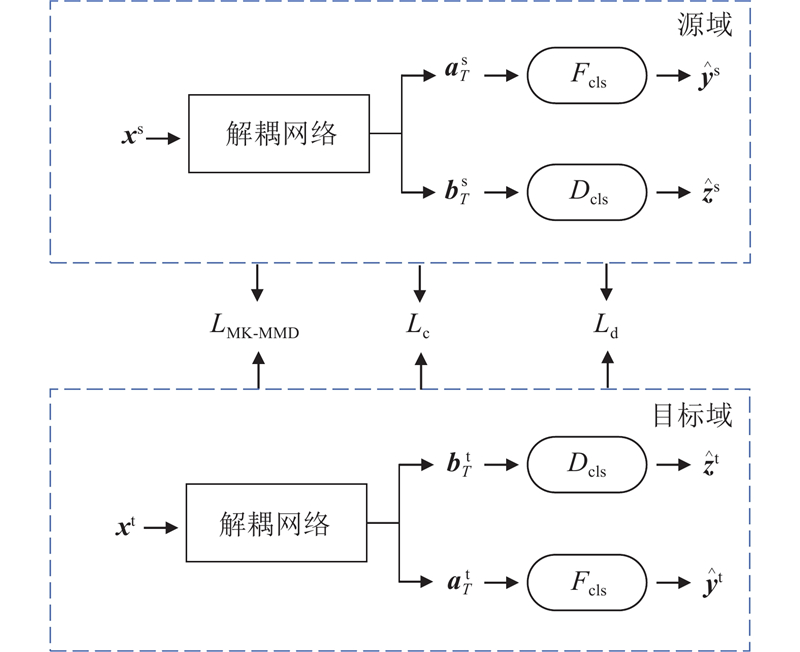 ... 由于源域和目标域的设备型号、工作状态、观测条件不同,采集数据之间往往存在域偏移,限制了模型的迁移能力. 解耦学习从采集样本中分离出反映设备工况的故障无关因素${{\boldsymbol{b}}_T}$  ,提高模型区分数据域的能力,促使模型学习域不变特征,提高迁移性能. 域自适应阶段的流程图如图4 所示,模型结合源域和目标域数据同时进行训练,在解耦出故障相关因素${{\boldsymbol{a}}_T}$  和故障无关因素${{\boldsymbol{b}}_T}$  后,分别经过故障分类器${F_{{\text{cls}}}}$  和域判别器${D_{{\text{cls}}}}$  输出结果,计算相应的损失函数. ${F_{{\text{cls}}}}$  和${D_{{\text{cls}}}}$  为带有 softmax函数和 sigmoid 函数的线性分类器,分别用于分类故障和判别域. 采用MK-MMD[22 ] 充分衡量源域和目标域之间的差异. MK-MMD源于MMD,MMD将低维数据映射到高维的再生核希尔伯特空间(reproducing kernel Hilbert space, RKHS)中,并利用核技巧(核函数与特征映射之间的内积满足$ k({{\boldsymbol{x}}^{\text{s}}},{{\boldsymbol{x}}^{\text{t}}}) = < \varphi ({{\boldsymbol{x}}^{\text{s}}}),\varphi ({{\boldsymbol{x}}^{\text{t}}}) > $  )求解特征间的平方距离. ...