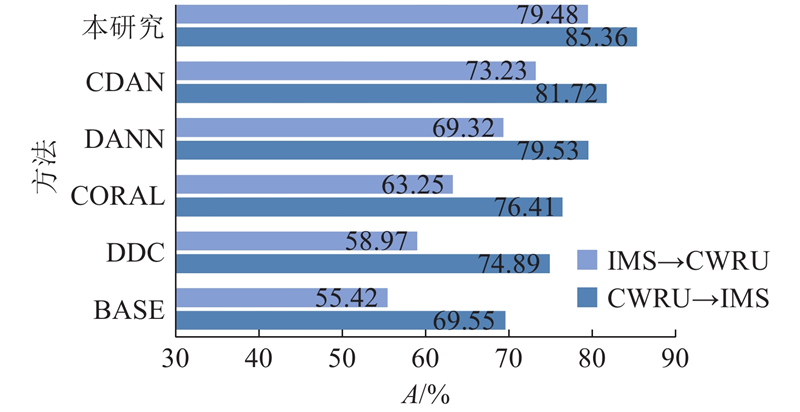 Tab.2  迁移任务 A /%BASE DDC[9 ]  CORAL[10 ]  DANN[11 ]  CDAN[13 ]  SFDA[14 ]  本研究 [1]-[2] 96.53 ± 0.12 95.71 ± 0.41 94.52 ± 0.51 96.43 ± 0.23 97.59 ± 0.13 96.83 ± 0.79 98.63 ± 0.07 [1]-[3] 92.84 ± 0.49 95.48 ± 0.25 92.34 ± 1.10 96.24 ± 0.53 99.17 ± 0.17 98.63 ± 0.84 99.39 ± 0.13 [1]-[4] 88.91 ± 0.93 92.19 ± 0.58 91.56 ± 2.08 97.82 ± 0.36 98.32 ± 0.21 96.25 ± 0.66 98.69 ± 0.19 [2]-[1] 98.82 ± 0.07 98.96 ± 0.43 98.33 ± 0.24 98.65 ± 0.20 99.10 ± 0.26 98.25 ± 0.45 99.89 ± 0.06 [2]-[3] 98.56 ± 0.21 97.79 ± 0.26 98.82 ± 0.09 99.37 ± 0.18 99.53 ± 0.06 97.22 ± 0.76 99.64 ± 0.09 [2]-[4] 92.67 ± 0.18 93.48 ± 0.91 94.72 ± 1.61 99.15 ± 0.32 98.97 ± 0.21 98.62 ± 0.47 99.23 ± 0.05 [3]-[1] 96.31 ± 0.42 96.99 ± 0.72 97.53 ± 0.14 92.85 ± 0.71 99.12 ± 0.13 96.09 ± 0.77 99.15 ± 0.08 [3]-[2] 97.15 ± 0.29 98.51 ± 0.44 99.49 ± 0.11 95.47 ± 0.93 98.87 ± 0.22 97.53 ± 0.49 99.92 ± 0.03 [3]-[4] 98.88 ± 0.06 99.22 ± 0.34 98.28 ± 0.07 99.64 ± 0.09 99.95 ± 0.13 98.85 ± 0.39 100.0 ± 0.00 [4]-[1] 81.09 ± 1.13 84.35 ± 0.81 88.37 ± 0.13 88.34 ± 0.45 92.23 ± 0.18 95.62 ± 0.42 97.42 ± 0.12 [4]-[2] 84.56 ± 0.75 89.61 ± 0.74 90.43 ± 0.38 87.48 ± 0.73 91.43 ± 0.61 93.26 ± 0.72 95.34 ± 0.21 [4]-[3] 95.93 ± 0.53 96.49 ± 0.63 97.03 ± 0.16 97.42 ± 0.16 98.81 ± 0.09 97.31 ± 0.59 98.82 ± 0.16