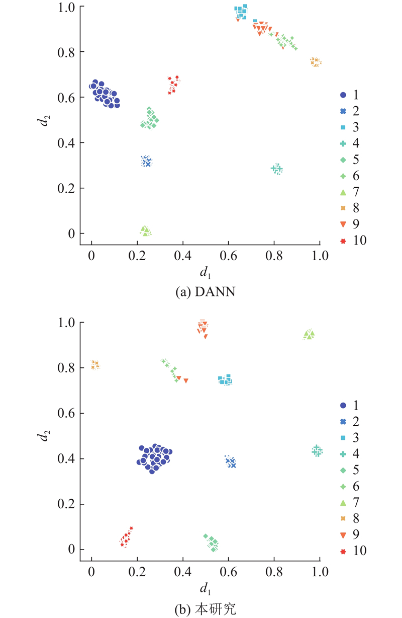 ... 基于t分布随机领域嵌入(t-distributed stochastic neighbor embedding,t-SNE)降维算法[29 ] ,将迁移任务[3]-[1]中学到的特征映射到二维平面,如图7 所示,${d_1}$  和${d_2}$  分别为降维后的特征维度. 迁移到新的数据域后,2种方法都能利用在源域学到的知识,有效缩小类内间距,聚合同一类型的故障. DANN不同尺寸的滚珠故障在分类阶段易发生混淆,因果解耦后的特征仅在类别9的识别上出现少量误判. 解耦后特征的各个类别之间有足够的决断距离,因此在特征的判别性上强于DANN. ...