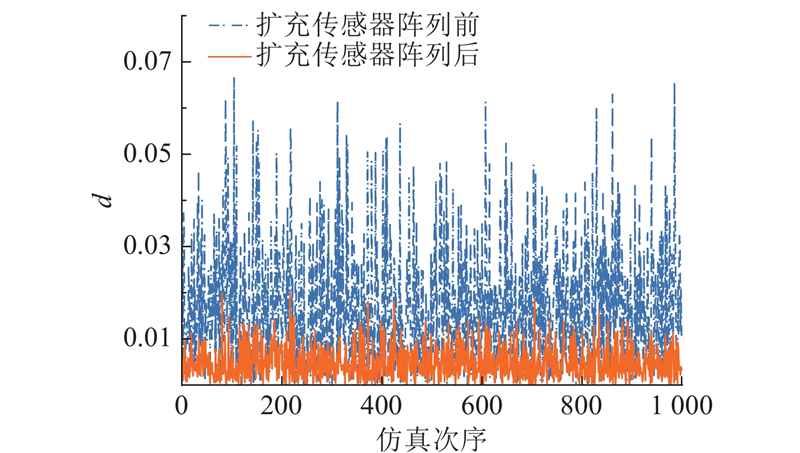 为了验证扩充传感器阵列的普适性,采用蒙特卡洛法模拟1 000组随机温度场,对所有模拟情况进行仿真分析. 以平均温度偏差为参考量,如图10所示为扩充传感器阵列前后各组仿真温度偏差d. 可以看出,扩充传感器阵列后的平均温度更为稳定可靠.