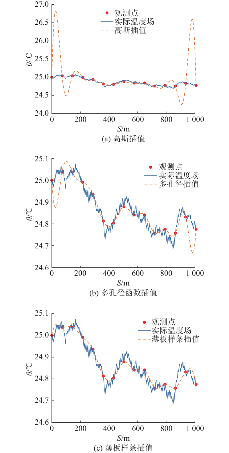 插值后物理场的观测点变得密集,进一步分析不同径向基插值函数的优劣,以确认最佳的径向基插值函数. 在径向基插值中,有多种具有良好平滑性的插值方法. 为了筛选出适用于本研究应用环境的插值方法,以高斯径向基插值、多孔径函数径向基插值和薄板样条径向基插值为例,在保证插值点数相同的情况下进行仿真实验分析,3种方法拟合出的温度场离散点偏差的对数均方根误差分别为−0.70、−0.306和−3.54,拟合结果如图11所示. 高斯插值出现明显的振荡现象,表明高斯插值不适用于高精度物理场拟合;多孔径插值方法比高斯插值的效果好,但在物理场两侧预测效果仍不理想;相比之下薄板样条插值的对数均方根误差小,拟合趋势表现最佳,且优于仅通过多项式拟合函数的情况. 该结果证明了多项式拟合融合径向基插值理论的优越性,本研究最终选择薄板样条插值作为拟合函数前的预处理函数.