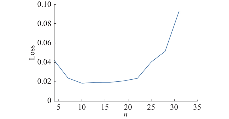 针对本研究提出的拟合方法,随着多项式次数的增加,函数拟合情况更接近插值后的物理场变化趋势. 多项式次数超过最优阶数后,拟合函数在采样点外的区域震荡剧烈,此时判定为过拟合. 为了避免过拟合现象的发生,引入损失函数对拟合情况进行评估. 如图12所示为均方根误差作为损失函数的情况. 当多项式次数较高时,函数的偏差几乎不变,甚至出现过拟合现象,继续增加多项式阶数不仅会降低函数的解释性,还可能导致拟合情况不佳. 如图13所示,使用自适应正则化方法对模型进行惩罚. 图中,损失函数极小值为1.85×10−2,对应的函数阶次为10. 加入正则化后误差呈现先下降后上升的趋势,表明多项式拟合阶数小会导致欠拟合,阶数大会导致过拟合. 该结果表明,所提拟合方法既提高了拟合精度,又避免了龙格现象和过拟合现象发生,是优良的拟合方法.