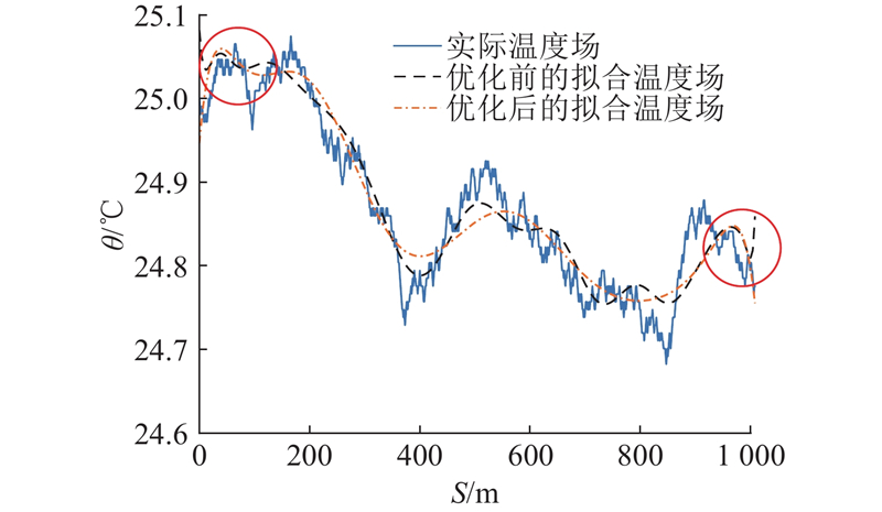 基于深度学习的高精度物理场拟合方法充分发挥了深度学习的优势,在使用正逆向时间序列分析的基础上,扩充一维环境场上的传感器阵列,使物理场拟合时的观测点位更为密集;径向基插值融合多项式拟合的混合代理模型在拟合前加入径向基插值处理,增强物理场拟合前的平滑性,避免发生龙格现象;将正则化加入混合代理模型的多项式迭代损失函数中进行最优化处理,选定最佳多项式拟合次数.