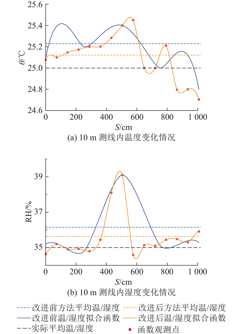 以测距距离10 m的情况为例,对比分析改进前后方法得出的测线内温度、湿度情况,测线场内的实际平均温度、相对湿度分别为25.00 ℃、35.00%. 改进前方法得出的平均温度、相对湿度分别为25.23 ℃、36.15%,改进后方法得出的平均温度、相对湿度分别为25.12 ℃、35.63%. 运用改进后的方法后,平均温度的精度提高了47.8%,平均湿度的精度提高了45.2%.