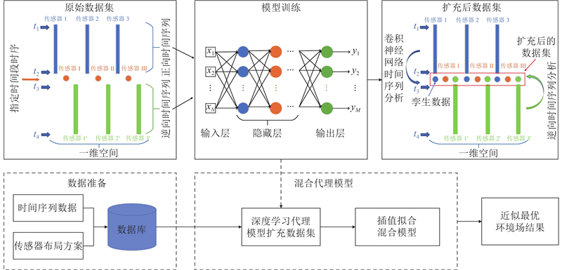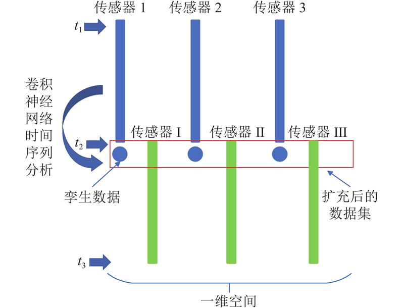 池化层主要用于减小特征向量的空间维度并降低计算量. 常见的池化操作有最大池化和平均池化,最大池化选择每个池化窗口中的最大值作为输出,有助于提取时间序列中的主要特性. 本研究采用最大池化法,以保留特征向量中最显著的特征. 结合改进后的一维卷积神经网络,基于深度学习正向时间序列扩充一维空间环境传感器阵列的方法如图3所示. 以三点传感器阵列为例,通过标注传感器1~3的点位,使传感器点位在一维空间中均匀分布,并实时测量