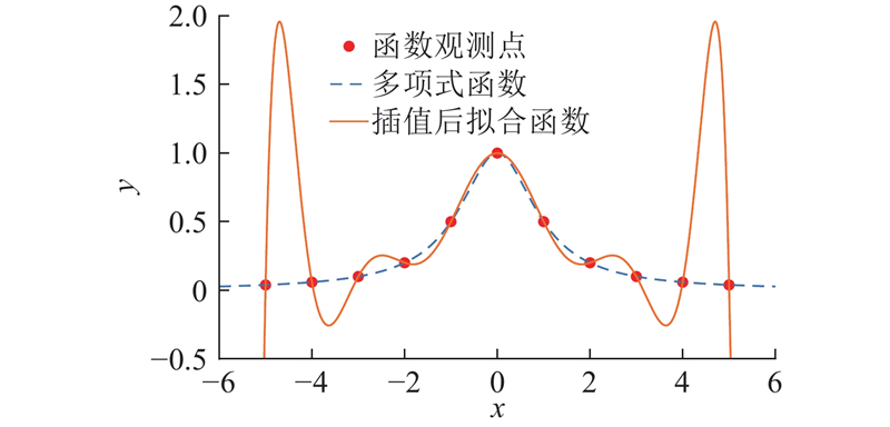 一般而言,多项式拟合时次数越高,对未知区域预测越准确. 在实际应用中,使用高次多项式预测时,拟合函数两端附近有时会出现剧烈的振荡,导致较大的误差,这种现象被称为龙格现象[17](Runge phenomenon).