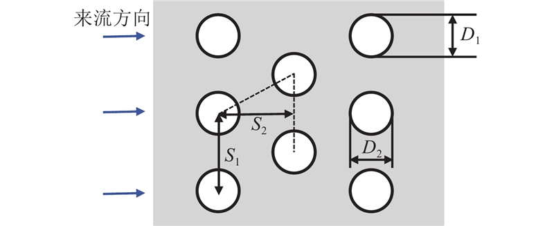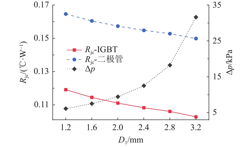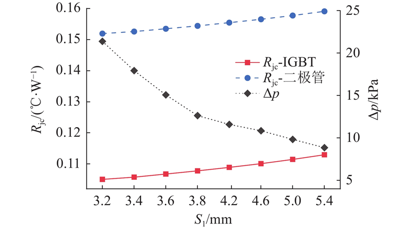 Pin-Fin散热器的结构特征如图11所示. 原始模块采用圆形Pin-Fin,其直径D1=2.3 mm,横向节距(垂直来流方向)S1=4.17 mm,纵向节距(平行来流方向)S2=3.61 mm. 分析D1与S1对芯片热阻和冷却液压降的影响规律. 设置D1=1.2、1.6、2.0、2.4、2.8、3.2 mm,其他参数保持原始设置. 不同直径下的芯片热阻和冷却液压降的变化如图12所示. 当D1从1.2 mm增至3.2 mm时,IGBT热阻降低0.016 ℃/W,降幅13%,这主要是对流换热面积的大幅增加(增幅达到82%)引起的. 冷却液压降呈现非线性增长趋势,在D1=2.4 mm处,压降增幅从2.2 kPa增加到6.6 kPa,主要原因是Pin-Fin柱间流道面积大幅缩小引起的流速大幅增加. 设置S1=3.2、3.4、3.6、3.8、4.2、4.6、5.0、5.4 mm,对应的Pin-Fin柱数量从18逐个递减至11,其他参数保持原始设置. 不同横向节距下的芯片热阻和冷却液压降的变化如图13所示. 随着横向节距的增加,热阻近乎线性增加,这是Pin-Fin柱数量减少导致换热面积减少引起的. 冷却液压降随着节距的增加而减小,这同样是由柱间流道面积的增加引起的.