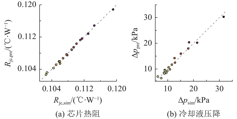 式中:f为优化函数,Rjc0、Δp0、mce0和mhs0分别为原始结构的芯片热阻、压降、陶瓷层和散热器的质量. Pin-Fin散热器结构对热阻的影响较小,为了避免出现热阻的负优化,对于Pin-Fin散热器的优化设置热阻值小于原始结构热阻值的约束条件. 针对陶瓷材料选择的优化函数,Si3N4的值最小,因此采用Si3N4代替Al2O3作为陶瓷基板材料. 对于Pin-Fin散热器,搜索得到最优的Pin-Fin结构参数:D1=1.201 mm,D2=2.456 mm,S1=3.203 mm,采用数值仿真方法进一步验证优化设计结果,为了便于加工,将设计参数取整,即D1=1.2 mm,D2=2.4 mm,S1=3.2 mm,同时将相同的参数用回归模型进行计算,对比结果如表5所示,最大相对误差为6.8%.