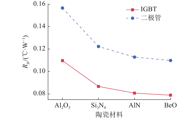 进行陶瓷材料对芯片热阻和陶瓷层内温度分布的影响分析,设置冷却液的体积流量为10 L/min,其他材料和结构保持不变. Al2O3陶瓷的热导率良好、绝缘性能优异且成本低,是常用的基板材料. 随着功率密度的增加,热导率更高的陶瓷如Si3N4(λ=90 W·m−1·℃−1)、AlN(λ=180 W·m−1·℃−1)和氧化铍(BeO,λ=240 W·m−1·℃−1)[33]等也被认为可以应用于功率模块. 如图6所示为使用不同陶瓷基板的功率模块的IGBT和二极管芯片热阻,热阻值随着陶瓷材料热导率的增加而降低. 相较于Al2O3,Si3N4的IGBT热阻降低了0.023 ℃/W,结温降低了11.48 ℃,但随着导热系数进一步提高,热阻降低的幅度逐渐减小,原因是随着陶瓷材料导热系数的增加,陶瓷传热环节占总热阻的比例降低,优化效果逐渐减弱.