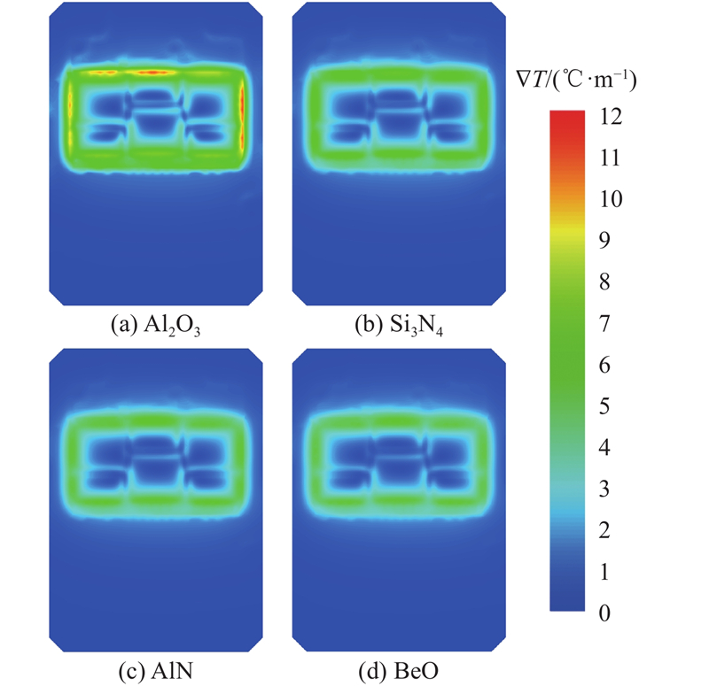 温度分布的均匀性是陶瓷基板性能的重要考量因素. 如图7所示为不同材料陶瓷基板的温度分布情况. 可以看出,随着热导率的增加,陶瓷基板的温度逐渐降低,同时温度分布变得更加均匀. 如图8所示为不同材料陶瓷基板的温度梯度
