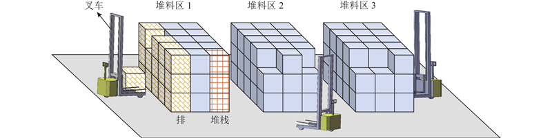 考虑到密集仓储系统中料框翻箱操作的可行性和实际应用场景,进行如下合理假设. 1)料框的检索和翻箱操作由单台前移式智能叉车在单个堆料区内独立执行,且堆料区有足够的空储位以满足最小料框翻箱操作的空间需求. 2)料框在堆料区中的存储位置和检索顺序已知且固定,在整个操作过程中,不考虑有新的料框被添加到堆料区. 3)每次翻箱操作仅针对目标料框出库路径上的阻碍料框进行.
