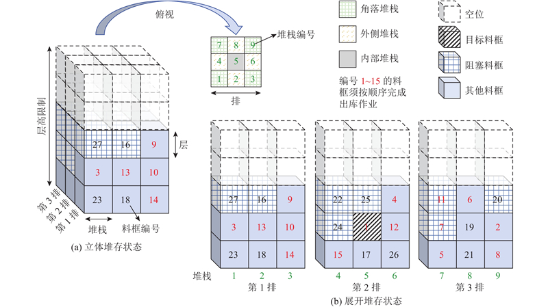 针对密集仓储系统调度问题的研究主要集中在多设备协同调度[4]、订单排序[5]和路径规划[6-7]等方面. Azadeh等[8]对不同类型的仓储系统进行分类和分析,概述了自动化仓储的发展趋势. 张牧仁等[9]针对四向车式密集仓储系统的货位分配问题,提出面向低能耗的货位分配优化模型以及自适应的差分进化求解算法. 马云峰等[10]针对四向穿梭车仓储系统中双端出库翻箱问题,设计启发式上界和估值函数来改进A*算法求得最优解. 许丽丽等[11]针对四向穿梭车系统复合作业调度问题,构建以出入库作业时间最短为目标的数学模型,设计改进的遗传算法来求解. 占翔南等[12]针对多深度四向穿梭车仓储系统调度优化问题,采用Hopcroft-Tarjan算法制定路径定向策略,以最小作业时间为目标构建出入库作业调度模型,并设计混合遗传算法进行求解;Roy等[13]基于四向车的密集仓储系统,研究货位停留点和交叉通道位置对系统性能的影响. 翻箱问题大多是针对集装箱装卸时的翻箱问题展开研究,智能叉车密集仓储系统的料框翻箱问题与集装箱堆场的集装箱翻箱问题(container relocation problem, CRP)具有相似性,其核心目标都是最小化总翻箱次数. Carlo等[14-15]对相关研究工作进行系统分类和总结. Kim等[16]提出CRP并给出该问题下界的计算方法,采用分支定界算法求解该问题的最优解. Zhu等[17]基于文献[16]中的下界,提出2种改进的下界计算方法,并在迭代深化A*算法中采用探测机制来更新已知的最优解决方案. Tanaka等[18]基于文献[17]提出更加严格的下界,构建快速求解的分支定界算法. CRP也被称为块重定位问题(block relocation problem, BRP),Caserta等[19]阐述BRP的定义并证明该问题属于NP难题(NP-hard),同时提出2种不同的二进制混合整数规划模型;有研究指出Caserta等构建的BRP模型的错误,并给出修正和改进的BRP模型[20-22]. 为了快速求解大规模BRP,Jovanovic等[23-25]开发出大量的启发式方法来寻找近似最优解. 张艳伟等[26]构建堆场翻箱动态决策模型,提出基于逆向强化学习的智能决策算法. Jin等[27]为非限制性CRP设计2个可以快速求解的下界和1组相互一致的优势规则,提出高效的迭代深化分支定界算法. Đurasević等[28]通过引入新的终端节点和几种解的构造方法,基于遗传规划方法自动对翻箱规则进行设计.