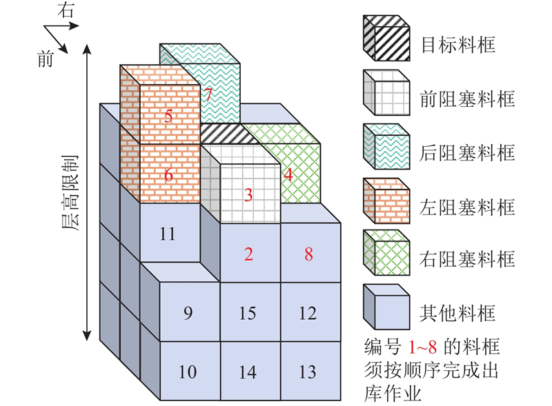 如图2所示,3×3×5布局的堆料区中储存有27个料框,其中编号1~15的料框须按序出库. 为了方便描述料框翻箱问题进行如下定义:当前堆存状态下出库序号最小的料框称为目标料框;各堆栈中大编号料框位于小编号料框之上且小编号料框需要出库时,大编号料框称为阻塞料框;当某堆栈中料框数量为0时称为空堆栈,否则为非空堆栈;当某堆栈四周都存在其他堆栈(包括空堆栈)时称为内部堆栈,其余堆栈则称为外侧堆栈,外侧堆栈中若某堆栈周围与之相邻的只有2个堆栈时称之为角落堆栈. 当前移式智能叉车在堆料区的狭窄空间内进行操作时,为了保证操作安全,每次只能沿直线叉取1个料框,且最多只能叉取(放)到2个料框长度方向上的物料. 当目标料框位于内部堆栈且无法仅通过对该堆栈阻塞料框进行翻箱后完成检索操作时,对目标料框所处堆栈四周某一侧出库路径上的料框进行翻箱操作以开辟通路. 出库路径上的堆栈称为阻塞堆栈. 出库路径选取规则:优先选择翻箱料框数量最少的一侧;若多侧需翻箱料框数量相等,则按该堆栈前后左右的顺序决定. 如图3所示,目标料框位于堆料区内部堆栈最顶层,前后左右出库路径上的阻碍料框数分别为1、2、2、1,根据上述规则,检索目标料框须先对料框3进行翻箱操作. 智能叉车密集仓储系统中料框的翻箱问题可以简单归纳如下:将堆料区中的部分料框按给定顺序依次进行检索操作,在整个检索过程中为须进行翻箱操作的料框选择合适的落位堆栈,最小化检索操作所需的总翻箱次数.