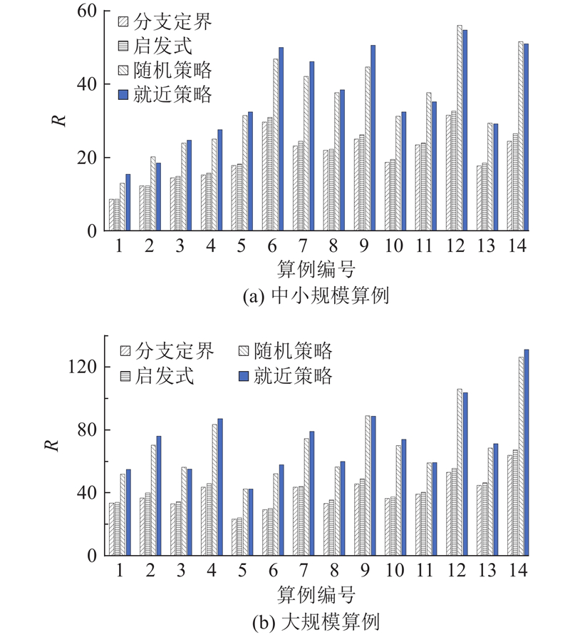 经调研发现,在某些企业的密集仓储系统中,使用前移式智能叉车进行料框翻箱作业时,翻箱落位堆栈的选择通常采用随机策略或就近策略. 随机策略即在可选落位堆栈中随机选择最终落位堆栈,就近策略即在可选落位堆栈中选择距离(本实验选用曼哈顿距离)最近的堆栈作为最终落位堆栈. 为了验证启发式方法和分支定界算法的性能表现,使用上述2种翻箱策略对算例进行求解. 如图4所示,在中小规模和大规模布局下,采用随机策略平均分别需要34.90和71.66次翻箱,采用就近策略平均分别需要36.01和74.05次翻箱,分支定界算法相较于随机翻箱策略翻箱次数平均减少了42.16%、44.48%. 结果表明,相比随机策略和就近策略,采用启发式和分支定界算法求解智能叉车密集仓储系统料框出库翻箱问题能明显减少料框出库翻箱次数,极大提高了仓储系统的作业效率.