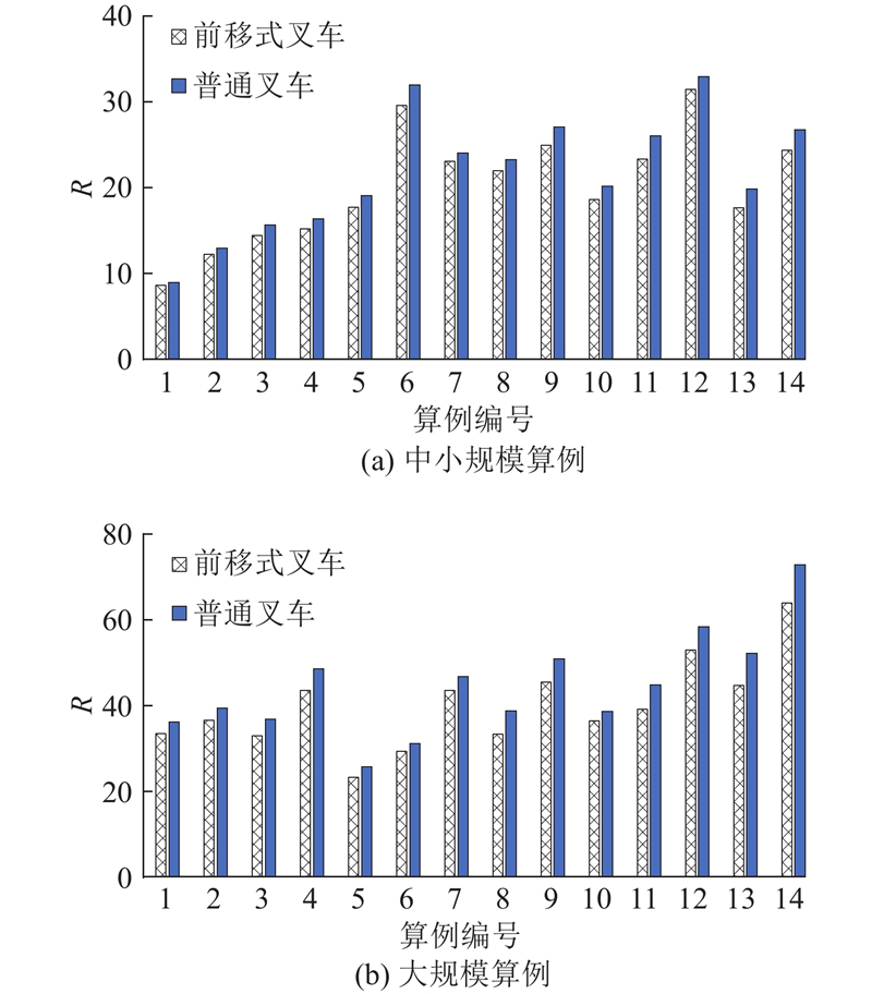 仓储设备的选择也会影响出库效率. 与普通叉车相比,前移式智能叉车具备可伸缩的货叉,能够适应多个料框长度方向上物料的搬运需求,在处理位于内部堆栈中的料框时具有明显优势. 为了对比分析不同仓储设备的出库性能,针对使用普通叉车的仓储环境,采用分支定界算法求解算例,对比实验结果如图5所示. 在中小规模和大规模布局下,使用普通叉车平均分别需要21.74和44.23次翻箱,前移式智能叉车相较于普通叉车翻箱次数平均分别减少了7.13%、10.05%. 结果表明,使用前移式智能叉车能在一定程度上减少检索内部堆栈料框产生的额外翻箱,有效提升密集仓储系统的吞吐量和出入库效率.