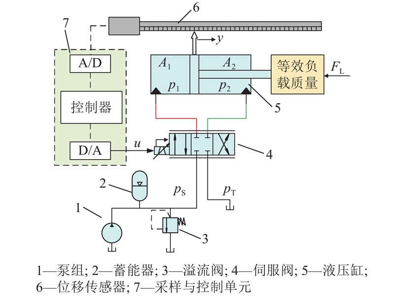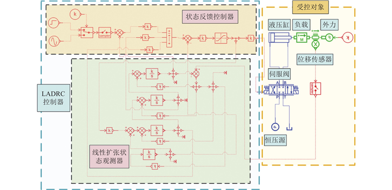 经典控制理论为系统建模与分析提供了基础[4],使得以PID为代表的线性控制策略被广泛应用于各类电液伺服位置控制系统中[5-7]. 随着现代控制理论的发展,电液伺服系统的状态空间模型和非线性控制方法的研究取得显著进展[8],以反步法为基础的自适应控制[9]、鲁棒控制[10-11]策略被相继提出. PID控制策略虽然能够实现高精度的静态稳定控制,但动态响应能力有限;控制策略(如鲁棒自适应)虽然能够提高系统响应能力,但存在参数调节困难、依赖模型的缺陷. 在此背景下,韩京清[12]提出自抗扰控制(active disturbance rejection control, ADRC)策略,Gao[13]改进ADRC,发展出兼具调节参数少、鲁棒性强、控制精度高、不依赖模型等优点的线性自抗扰控制(linear active disturbance rejection control LADRC),为控制系统设计提供了新的方法.